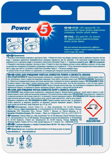 Блок для очистки унитаза Power 5 Свежесть океана, 2*55г. DOMESTOS