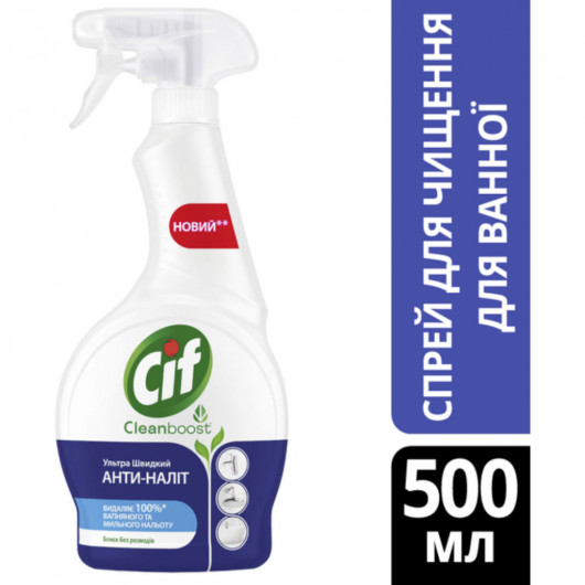 Обновленный спрей Cif Ультра быстрый Антиналет имеет инновационную улучшенную формулу с технологией CleanBoost и обеспечивает удаление 100% мыльного и известкового налета с любых поверхностей по всему дому.