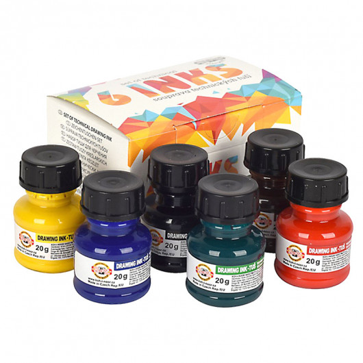 Тушь для черчения Koh-I-Noor, на водной основе, флаконы по 20г:, картонная упаковка, набор 6 цветов: желтая, красная, синяя, зеленая, коричневая, черная